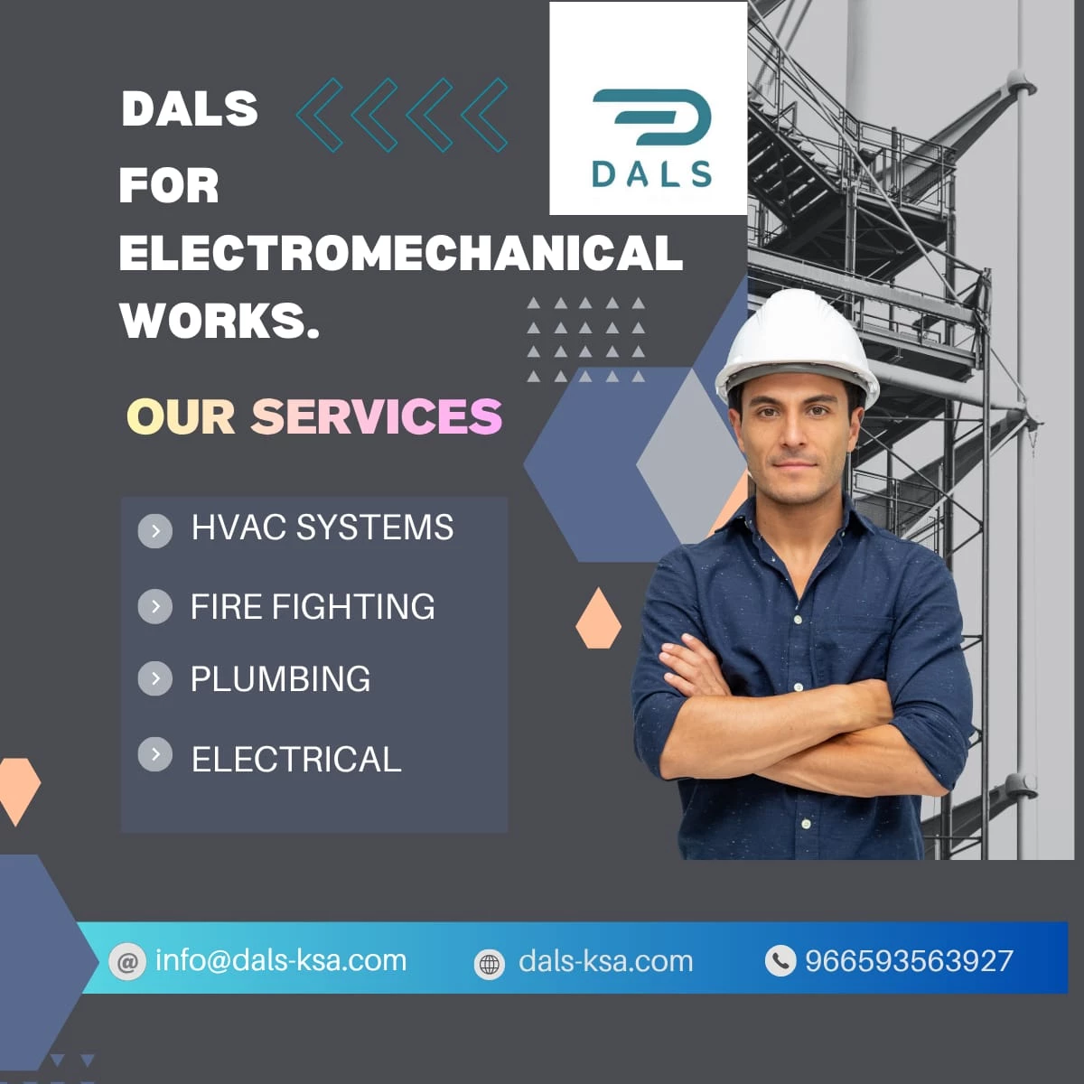 Dals company specializing in electromechanical works,a Saudi-based company established in 2015 in Mecca. We specialize in delivering high-quality MEP (Mechanical, Electrical, and Plumbing) services, including supply, installation, testing, commissioning, and maintenance for a wide range of electromechanical systems such as HVAC, firefighting, plumbing, BMS, and electrical systems.