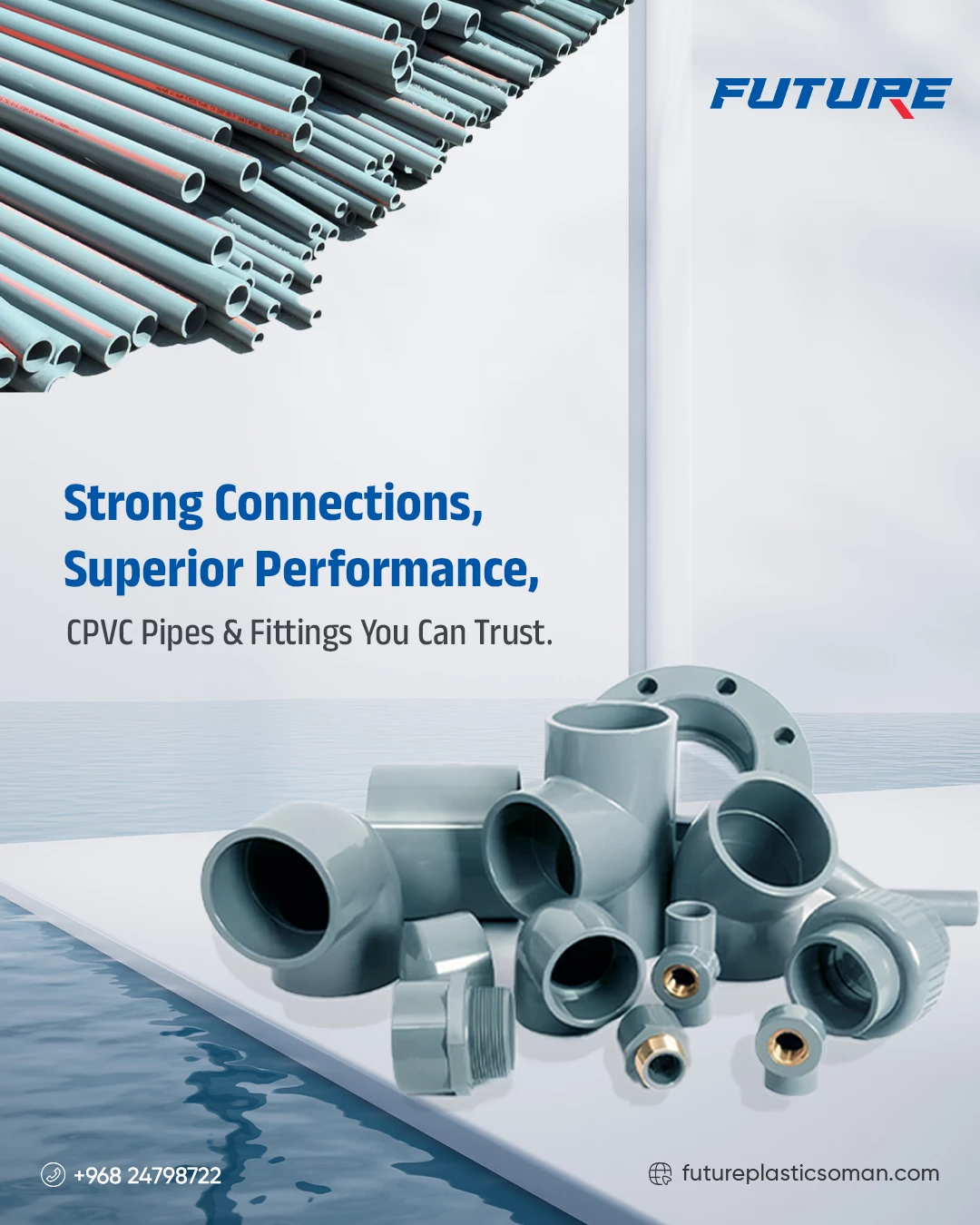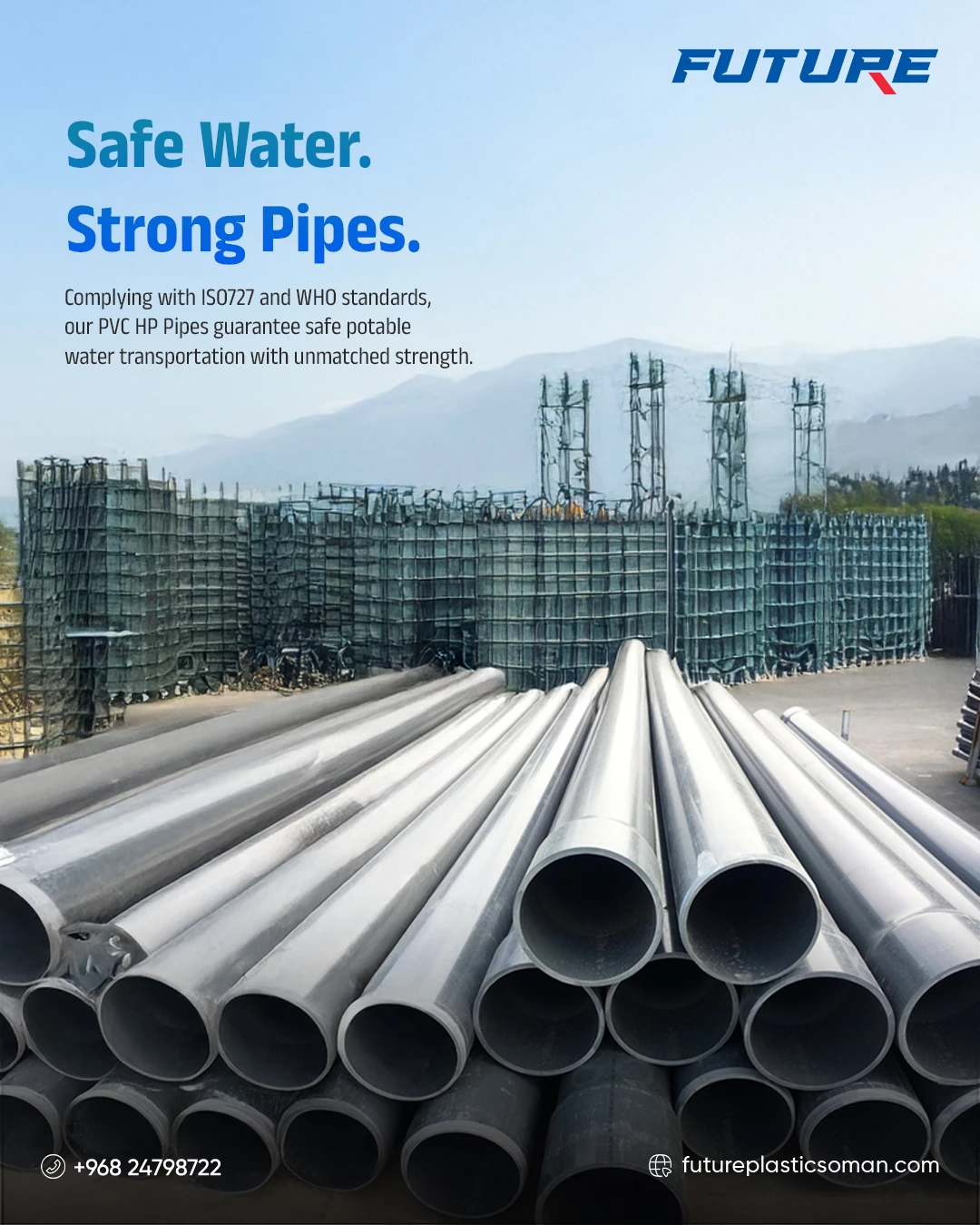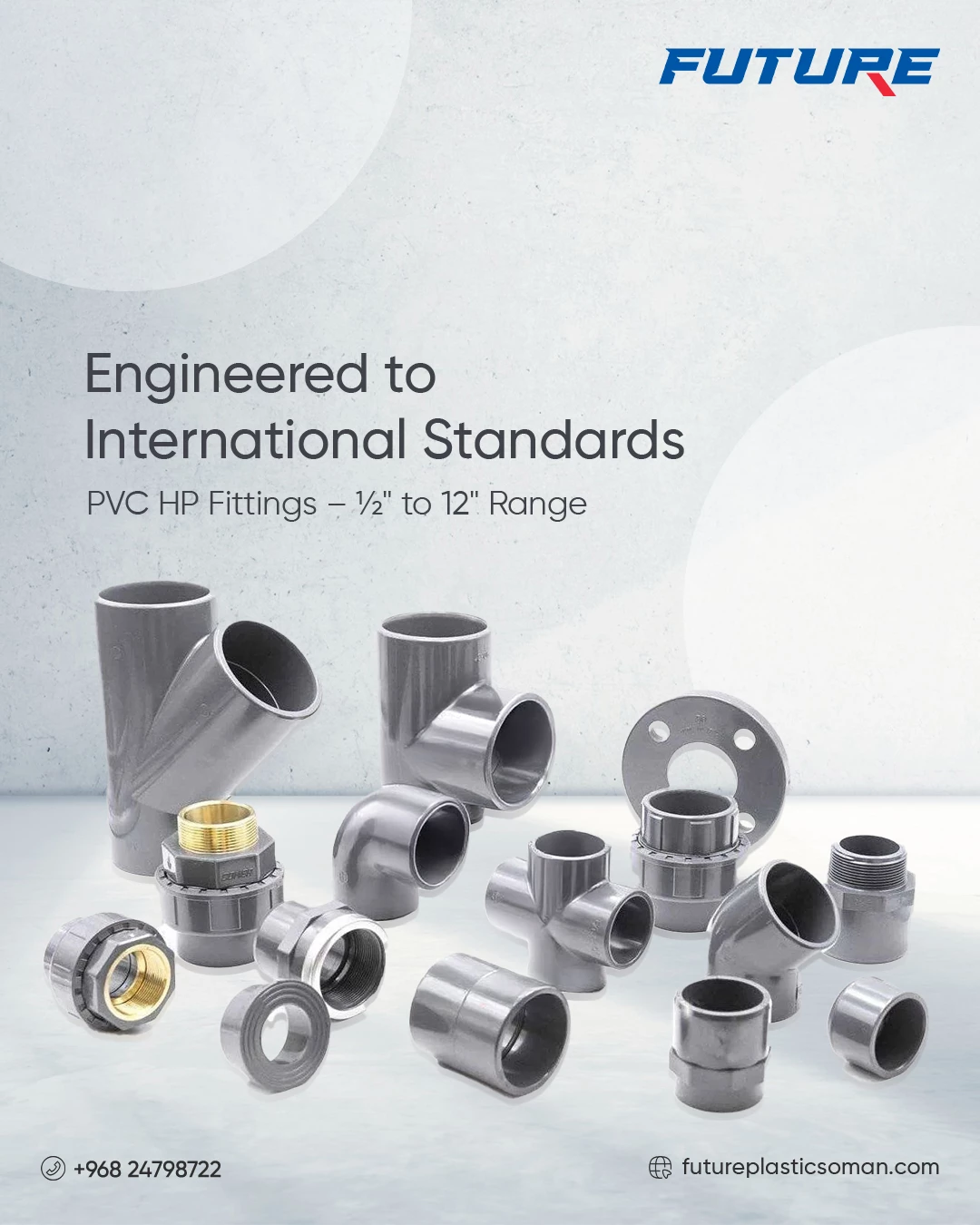 Established in 1999, Future Plastics is a trusted manufacturer and supplier of PVC HP Pipes, UPVC Pipes, HDPE Pipes, CPVC Pipes, and advanced plastic pipe fittings in Oman. With over 25 years of expertise, we operate from our modern facility located in Sohar Industrial Estate, delivering premium-quality piping solutions for residential, commercial, industrial, and infrastructure projects across Muscat, Ruwi, Salalah, and nationwide.